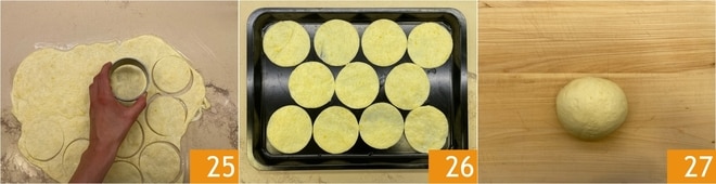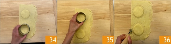 Pegue um cortador de biscoitos de 10 cm e com a parte menor pressione levemente para dar um pouco de forma, mas sem cortar 34, depois vire e marque a forma usando a parte maior 35. Corte então a circunferência usando uma roda cortadora 36.