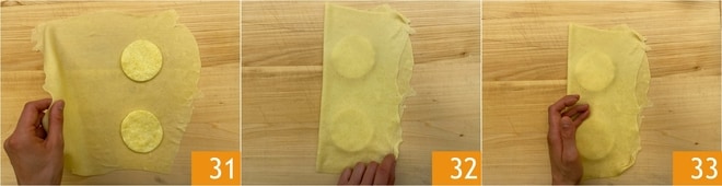 Coloque na massa alguns discos de queijo 31, ajuste-se de acordo com o comprimento da massa. Dobre a massa para cobrir completamente os discos 32 e com a mão faça uma leve pressão ao redor do queijo para expelir o ar 33.