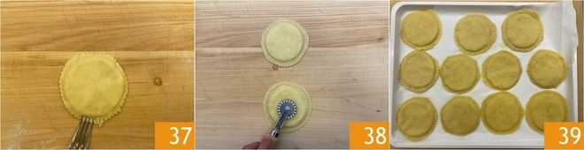 Sele a borda com a roda apropriada ou com os dentes de um garfo 37. Se preferir, decore também a parte central 38. Continue assim até formar todas 39.