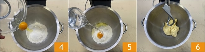 Adicione também o ovo 4 e a água 5. Comece a misturar em velocidade baixa até obter uma mistura homogênea e uniforme 6. Isso levará cerca de 15 minutos.
