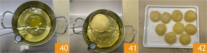 Aqueça bastante óleo vegetal entre 130-140°C no máximo e mergulhe 1 seada por vez para não abaixar muito a temperatura do óleo. Cozinhe-a auxiliando-se com uma colher para banhá-la com o óleo quente. Quando estiver bem inchada e dourada, escorra 41. Continue dessa forma, escorrendo as seadas aos poucos em uma bandeja forrada com papel toalha 42.