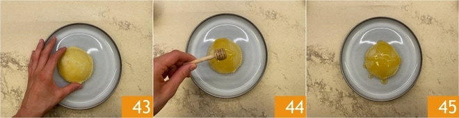 É hora de servir as seadas quentes: coloque a primeira em um prato 44 decore com mel 44 e aproveite 45!