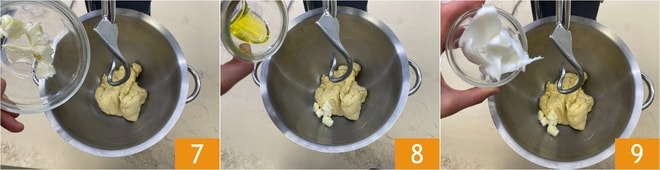 Neste ponto, adicione as gorduras: manteiga 7, azeite de oliva extra virgem 8 e banha 9.