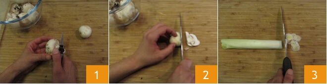 Para preparar os sedanini gratinados no forno, comece pela limpeza dos cogumelos champignon. Após remover a base terrosa 1, limpe a superfície com um pano úmido. Corte-os em fatias 2 e reserve. Em seguida, limpe o alho-poró removendo as duas folhas externas e aparando-o, depois corte-o em rodelas finas 3.