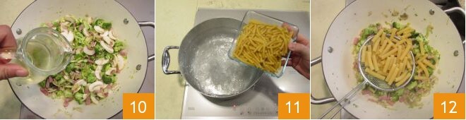 Após o fundo estar bem dourado, ajuste o sal sem exagerar, regue com o vinho branco 10 e deixe a parte alcoólica evaporar antes de baixar o fogo e continuar a cozedura por mais 10 minutos. Enquanto isso, cozinhe a massa em água fervente e salgada 11, assim que estiver al dente, escorra-a diretamente na panela 12.
