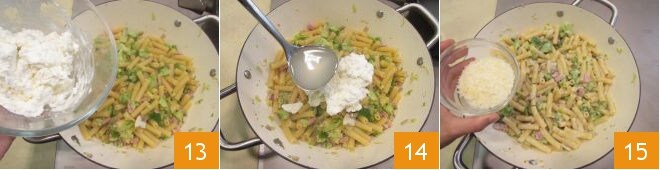 Adicione a ricota 13, uma concha de água de cozimento da massa e misture 14. Depois de ajustar a consistência, você pode desligar o fogão e adicionar o caciocavallo ralado 15