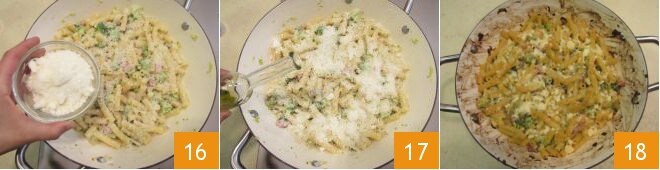e depois o pecorino também ralado 16. Adicione um fio de azeite e não misture 17. Transfira a panela para o forno, já pré-aquecido em modo estático a 200°, e deixe dourar tudo por cerca de 25 minutos. Ao final do cozimento, rale um pouco de pimenta preta e sirva seus sedanini gratinados no forno ainda muito quentes 18.
