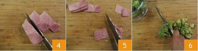 Com uma faca, fatie o presunto cozido; você deverá obter fatias de meio cm de espessura 4. A partir delas, corte pequenos cubos 5. Por fim, pique grosseiramente as flores de brócolis 6 e passe para o cozimento.