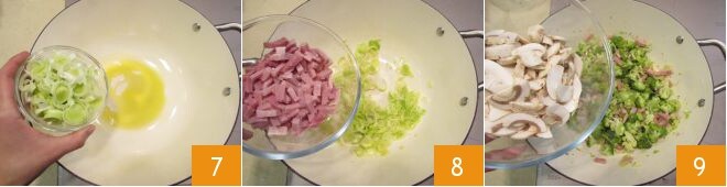 Em uma panela, daquelas adequadas para ir ao forno, aqueça um fio de azeite e adicione o alho-poró 7 e o presunto 8. Deixe refogar por alguns instantes antes de adicionar também os brócolis e os cogumelos 9.