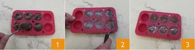 Para preparar o semifreddo de pistache e Nutella, comece fazendo o coração de Nutella. Pegue a forma de silicone em formato de meia esfera e, com a ajuda de uma colher, preencha com a Nutella 1. Nivele bem com uma espátula 2, até limpar toda a superfície da forma 3. Cubra com filme plástico e coloque no freezer por pelo menos 2 horas. Desta forma, você obterá 6 meias esferas de Nutella de 25 gramas cada.