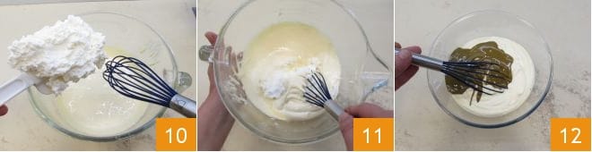 Neste ponto, incorpore o creme de leite batido na mistura das gemas 10, mexendo delicadamente com um batedor, sem desmontar a mistura 11. Adicione também a pasta de pistache, após misturá-la, e, ainda utilizando um batedor, misture tudo 12.