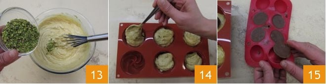 Por fim, adicione também o granulado de pistache 13 e incorpore à mistura. Pegue uma forma de silicone (você pode escolher o formato que preferir) e coloque 1 colher de sobremesa generosa em cada porção 14, para criar uma base, então tire do freezer a forma com as meias esferas de Nutella e desenforme-as 15.