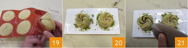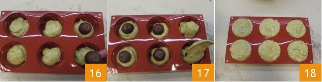 Insira então as esferas de Nutella no centro de cada forma 16. Cubra com o semifreddo de pistache até preencher completamente a forma 17 e nivele bem a superfície 18 com uma espátula. Coloque seu semifreddo de pistache e Nutella no freezer por pelo menos uma noite.