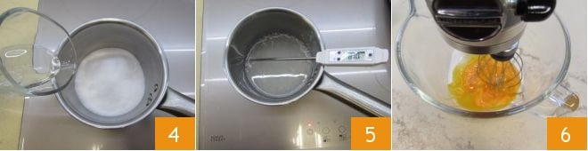 Após 1 hora e meia, prossiga com a preparação do semifreddo. Coloque o açúcar em uma panela de fundo grosso e adicione também a água 4, depois leve ao fogo e leve a calda a 121°C 5 (utilize um termômetro de cozinha para medir a temperatura correta). Enquanto isso, coloque as gemas na tigela de uma batedeira e comece a batê-las 6 apenas quando sua calda estiver quase atingindo a temperatura indicada.
