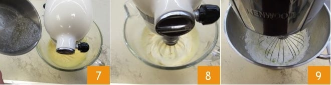 Uma vez que a calda atingir 121°C, despeje em fio na batedeira em ação 7 e continue batendo até o completo resfriamento da mistura 8. Enquanto isso, bata também o creme de leite fresco até ponto de neve 9.