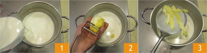 Para preparar a semolina doce, coloque o leite em uma panela 1, aromatize com as raspas de um limão 2 e o açúcar. Deixe o açúcar dissolver, quando o leite ferver, retire as raspas de limão 3.