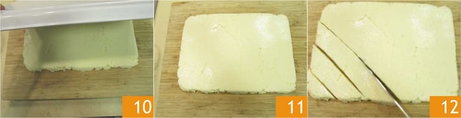 Vire a semolina sobre uma tábua de corte 10 11. Corte tiras diagonais de aproximadamente 3-4 cm de largura com uma faca de lâmina lisa 12.