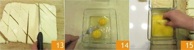 Depois corte tiras na vertical, também de 3-4 cm de largura 13 para criar losangos, você obterá cerca de 40 peças. Bata os ovos em uma tigela 14. Agora passe os losangos primeiro no ovo 15.