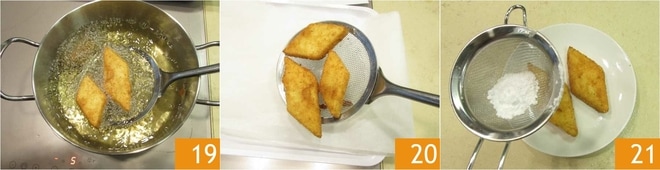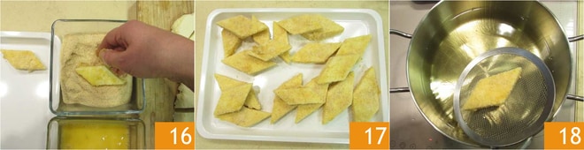 depois na farinha de rosca 16 e coloque em uma bandeja 17. Aqueça o óleo de sementes em uma panela, quando atingir 170ºC mergulhe os losangos 18