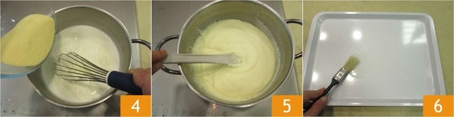 Despeje a semolina aos poucos e misture com um batedor 4. Substitua o batedor por uma espátula e continue cozinhando por cerca de 20 minutos em fogo baixo até que a mistura esteja bem firme 5. Unte com óleo de sementes uma bandeja de 40 x 30 cm 6.