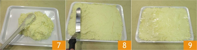 Despeje a semolina 7 e nivele bem com uma espátula para distribuí-la de forma homogênea 8, cubra com filme plástico e deixe esfriar em temperatura ambiente, depois transfira para a geladeira para firmar 9 por 8 horas ou durante a noite.