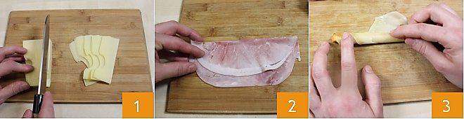 Para preparar os grissini de forno com presunto e Emmental, comece cortando 12 fatias finas de Emmental 1, depois coloque uma fatia de presunto cozido em uma tábua e corte-a ao meio no sentido da largura 2. Em seguida, pegue um grissini de tomate e coloque a fatia de Emmental ao redor dele 3, no centro do grissini de tomate, de modo a deixar ambas as extremidades livres.