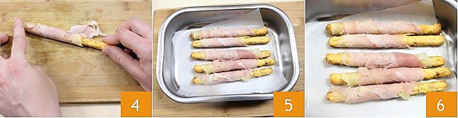 Enrole da mesma forma também a fatia de presunto cozido 4. Coloque os grissini assim guarnecidos em uma assadeira coberta com uma folha de papel manteiga 5. Asse a 190° em forno estático já quente (160° em forno ventilado) por cinco minutos, até o queijo derreter 6.