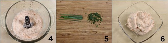 Você deve obter uma consistência cremosa 4. Pique finamente a cebolinha 5 e incorpore à mousse 6, depois coloque a mistura em um saco de confeitar com bico estrela.