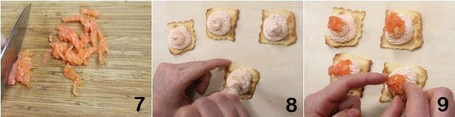 Neste ponto, corte o restante do salmão em julienne 7 e comece a compor os aperitivos: esprema um pouco de creme de salmão em cada cracker 8 e coloque pedaços de salmão defumado 9.
