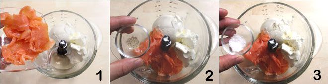 Para preparar os folhados clássicos com quark e salmão defumado, comece preparando a mousse de salmão. Em um mixer, bata o queijo quark com 80 gr de salmão 1, uma pitada de pimenta branca 2 e uma pitada de sal 3, o suficiente para dar sabor.