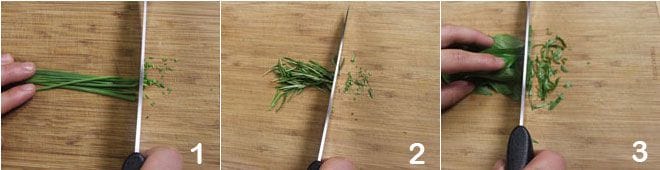 Para preparar os folhados com manteiga aromatizada e anchovas, comece picando finamente a cebolinha 1 e o alecrim 2, depois coloque-os juntos em uma tigelinha. Pique também as folhas de manjericão 3 e adicione-as à manteiga, que deve estar em temperatura ambiente,