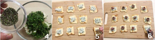 depois adicione também o picado de ervas aromáticas 4. Misture bem a manteiga com a ajuda de um garfo, até obter a consistência de uma mousse. Coloque a mistura em um saco de confeitar com bico estrela e comece a montar os folhados: esprema um montinho de creme de manteiga em cada folhado 5 e coloque um filé de anchova enrolado 6.