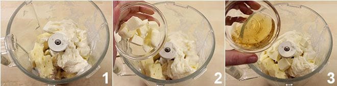 Para preparar os folhados com creme obatzda e páprica, comece pelo creme: coloque em um processador o camembert (de preferência bem maduro) e o stracchino 1. Adicione a manteiga amolecida 2 e 4 colheres de sopa de cerveja clara 3. Bata tudo bem até obter uma consistência lisa e cremosa.