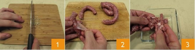 Para preparar a tortinha de arroz recheada, comece preparando o Caldo de legumes. Em seguida, pique finamente o funcho 1 e reserve. Pegue a salsicha, faça um corte na pele 2 e, depois de retirá-la puxando, desfaça a salsicha grosseiramente com as mãos ou os dentes de um garfo 3 e reserve também.