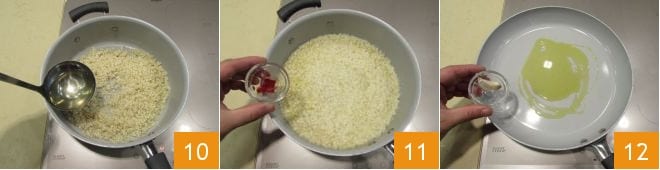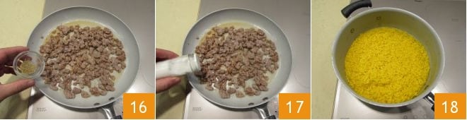 Continue a cocção do arroz, adicionando uma concha de caldo sempre que o anterior tiver sido completamente absorvido 10. Dez minutos antes do fim da cocção do arroz, adicione o açafrão 11 e misture bem ao arroz para dar uma coloração e sabor uniformes. Ajuste o sal e a pimenta. Enquanto continua a cozinhar o arroz adicionando o caldo, dedique-se também à preparação da salsicha: em uma frigideira antiaderente, coloque o azeite e doure um dente de alho 12.