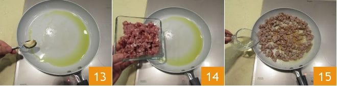 Quando obtiver uma coloração dourada, retire-o 13 e adicione a salsicha desfeita 14. Cozinhe em fogo alto por cerca de 7-8 minutos, regando com o vinho branco 15 que depois deixará evaporar.