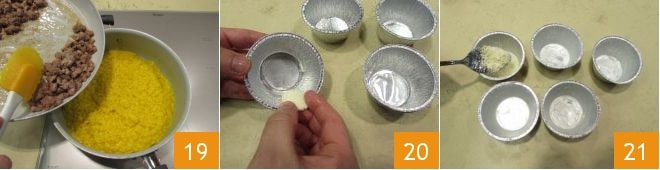 Adicione ¾ da salsicha ao risoto 19, misture bem e deixe esfriar. Enquanto isso, pegue 8 forminhas de alumínio descartáveis e unte-as com manteiga 20, fazendo o queijo ralado aderir bem à superfície interna 21. Para esta operação, você pode colocar queijo ralado dentro da forminha e depois deixá-lo deslizar pelas paredes, inclinando suavemente a forminha com as mãos: você deverá criar uma espécie de revestimento para toda a superfície.