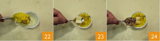 Coloque dentro de cada forminha 1-2 colheres de risoto com a salsicha 22 e, com a ajuda de uma colher de chá, faça aderir bem ao fundo e às paredes do seu suporte para as tortinhas: você deverá criar um buraco no centro da forminha. Coloque alguns cubos de queijo 23 e um pouco da salsicha que você reservou 24.