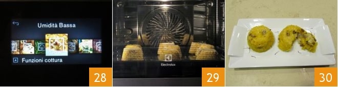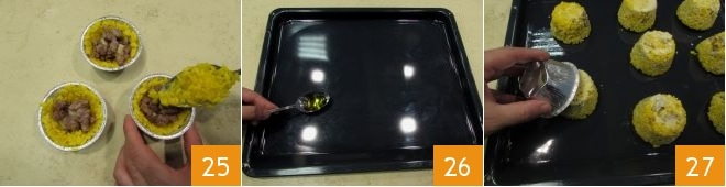 Em seguida, cubra o recheio com mais arroz de modo que fique completamente escondido dentro 25. Repita a operação para todas as outras forminhas. Neste ponto, pegue uma assadeira e unte-a com óleo 26, se preferir, pincelando o óleo por toda a sua superfície. Desenforme as forminhas na assadeira com cuidado para que mantenham a forma 27.