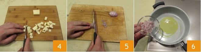 Depois, pegue o queijo, corte-o em tiras e depois em cubos de igual tamanho 4 que servirão para o recheio das tortinhas. Prossiga picando finamente uma cebola 5 que você irá dourar com o azeite em uma panela antiaderente 6.
