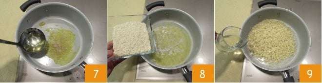 Adicione uma concha de caldo quente 7 e deixe a cebola murchar. Quando o caldo estiver completamente seco, toste o arroz por 1 minuto 8, mexendo continuamente para evitar que grude no fundo da panela. Em seguida, regue com vinho branco 9 e deixe evaporar.