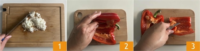 Para preparar o shakshuka, comece descascando a cebola e picando-a finamente 1, depois lave o pimentão, divida-o ao meio 2 e retire o talo, as sementes e os filamentos internos 3.