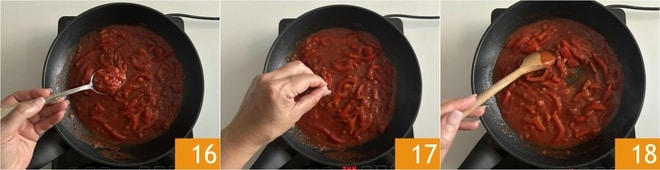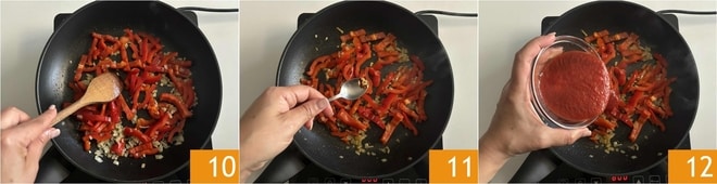 Neste ponto, após dar uma mexida 10, adicione uma pitada de pimenta vermelha 11 e o molho de tomate 12.
