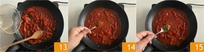 Despeje um pouco de água 13 e tempere com páprica 14 e cominho 15.