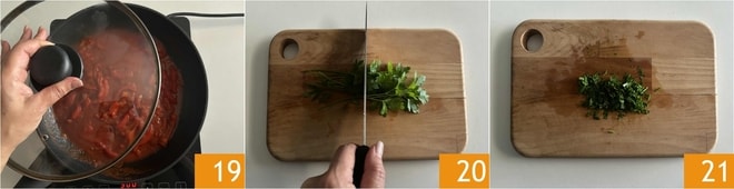 Neste ponto, cubra com a tampa e continue cozinhando em fogo baixo por cerca de 20 minutos, mexendo de vez em quando 19. Agora lave e pique um ramo de salsinha (ou coentro) 20 e reserve, você vai usá-lo ao final do cozimento 21.
