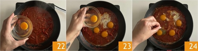 Resta apenas despejar os ovos um a um 22, cuidando para não quebrar as gemas 23, cozinhe-os por cerca de 3 ou 4 minutos, ao final do cozimento, a clara deve estar branca e a gema bem cremosa. Ajuste o sal 24.