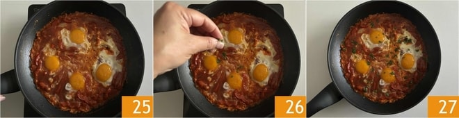 Uma vez que os ovos estejam prontos 25, adicione a salsinha fresca picada 26, desligue o fogo e sirva o shakshuka bem quente 27.