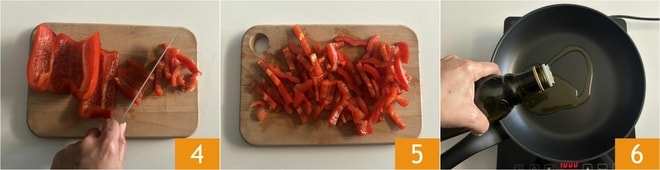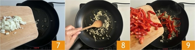 Em seguida, comece a cozinhar a cebola picada 7, deixe-a murchar em fogo baixo 8 e adicione os pimentões 9.