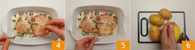 Adicione também o alecrim 4 e o alho com casca 5. Mergulhe bem as coxas na emulsão e deixe descansar por alguns minutos. Enquanto isso, descasque as batatas 6 e corte-as em cubos de cerca de 3 cm, depois lave e seque-as com um pano limpo.