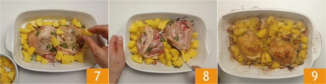 Coloque-as na assadeira 7, ajuste o sal e a pimenta e misture tudo 8. Cozinhe em forno ventilado e pré-aquecido a 180°C por 85 minutos, virando o frango de vez em quando. Uma vez cozido, prolongue o cozimento por mais 5 minutos no modo grill. Deixe esfriar e suas coxas de frango assadas no forno estão prontas para serem servidas 9.